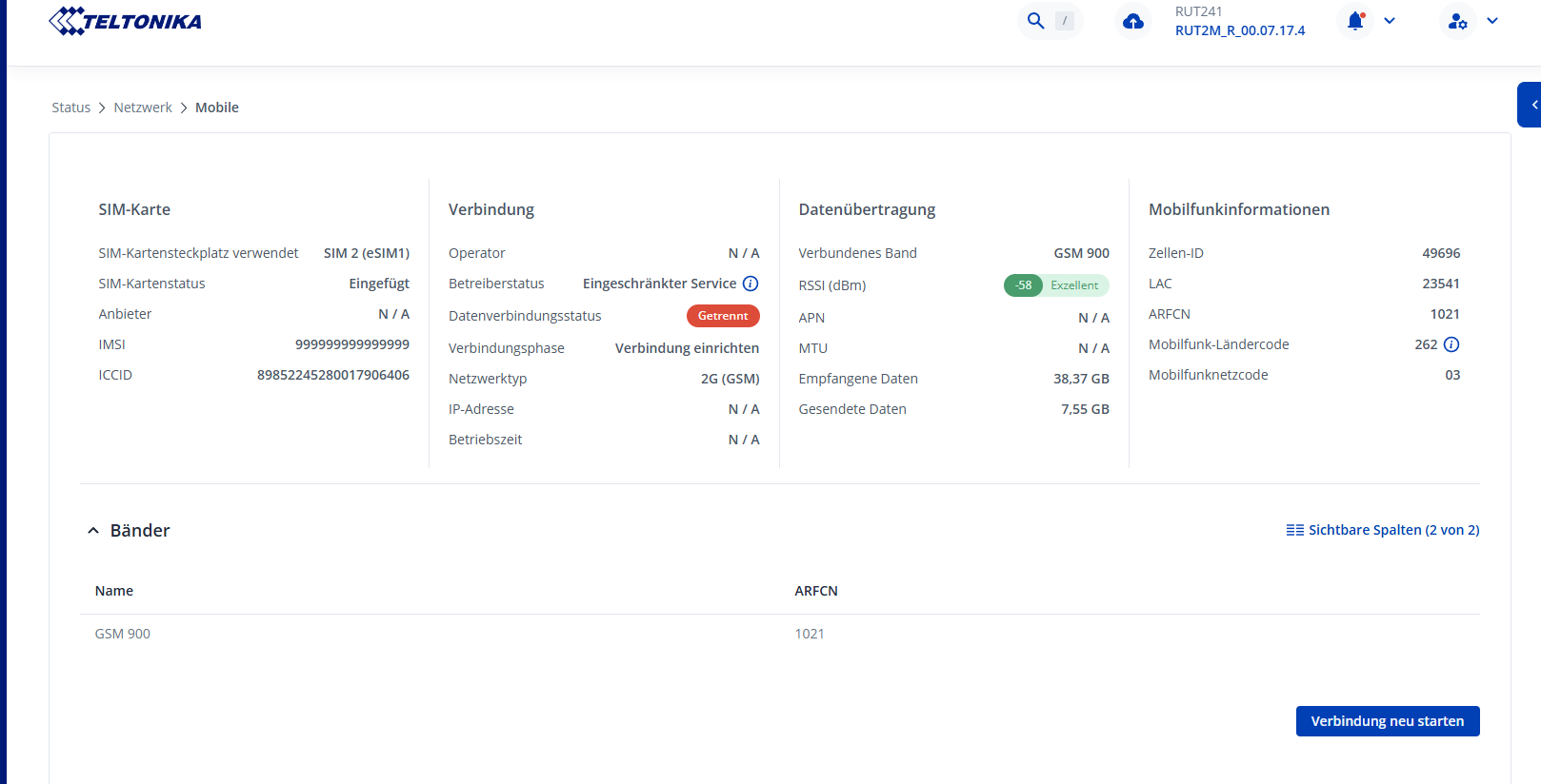 Die eSim hat auf meinem neuen Router seit dem Kauf im Juli 2025 bis September funktioniert. Dann habe ich im Routerprogramm auf dem Laptop ein erforderliches update gemacht. Dann funktionierte die eSim nicht mehr. Der WLAN-Shop 24 stellte damals fest, daß das Programm die IMSI -Nummer geändert hat in nur 9er: 99999999……Leider ist der Shop insolvent, so daß er mein Problem nicht mehr lösen konnte. Die Firmware-version ist RUT2M_R_00.07.17.4.