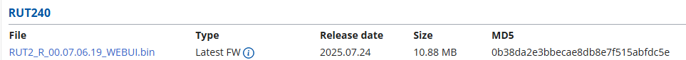The issue is that my RUT240 is currently only booting into the firmware recovery page (bootloader). In this mode, the device rejects all WebUI images with “Incorrect checksum” and requires a proper FACTORY image to recover.