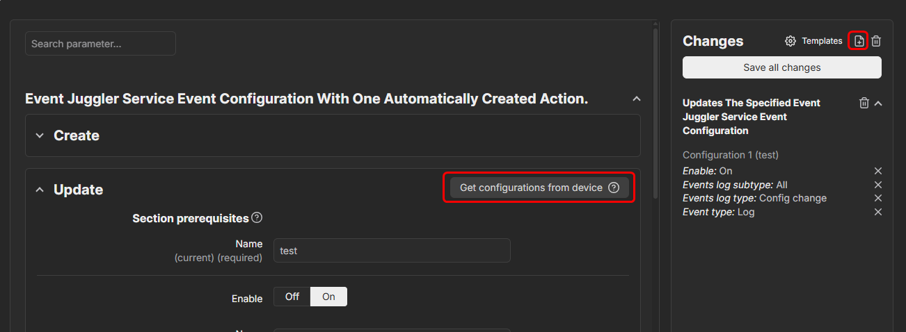 You head to Management → Devices → Device Configuration, and find the Events Juggler section, where you can then press the little Get configurations from device button. Afterward, the sidebar will pop out on the right-hand side and you will be able to save it as a template for future use, or rather, to apply to other devices as well.