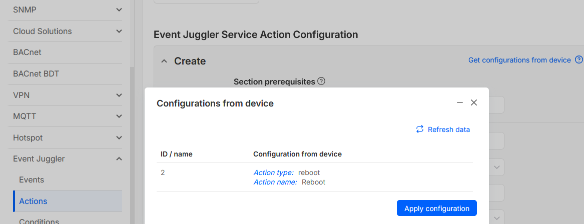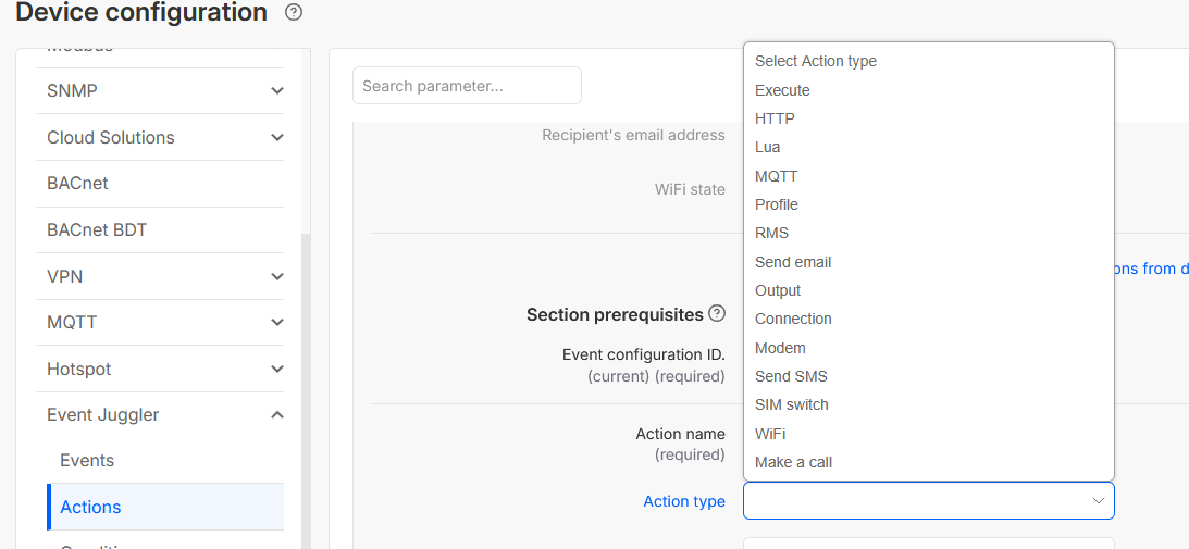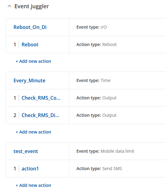 I want to configure the digital input 1 to reboot the device → The action reboot is not available in the Event Juggler Action type section on RMS. See screenshot: