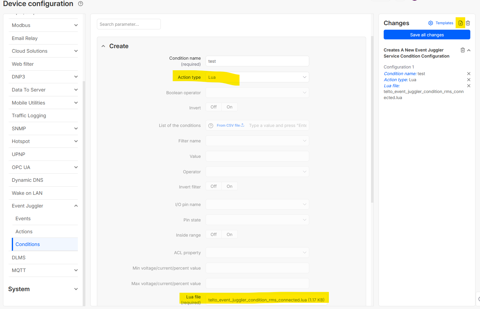 The LUA-Scripts are working as expected, but if i upload a “Event Juggler Condition” from the configured device with as LUA-Script in it, the script itself is not uploaded.