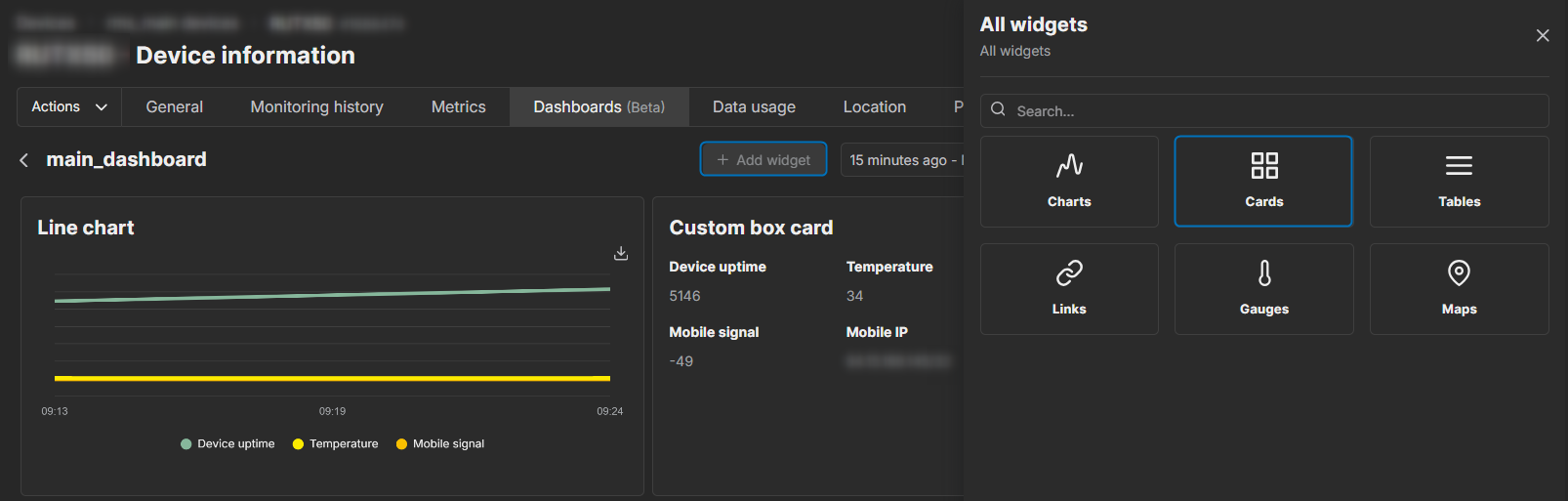 According to the RMS team, it’s very unlikely that widget functionality within the General device view page will be reintroduced in the near future. However, you can utilize the Cards → Custom box widgets feature within the RMS dashboards to display your desired information: