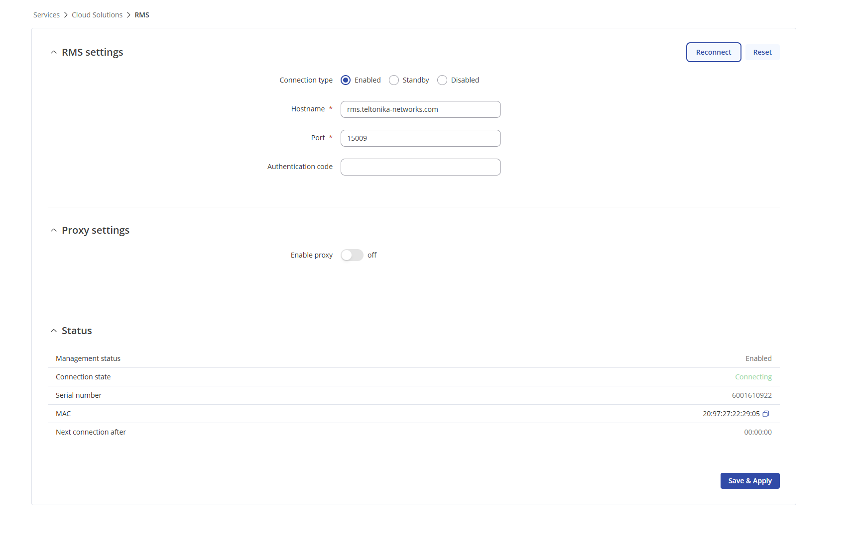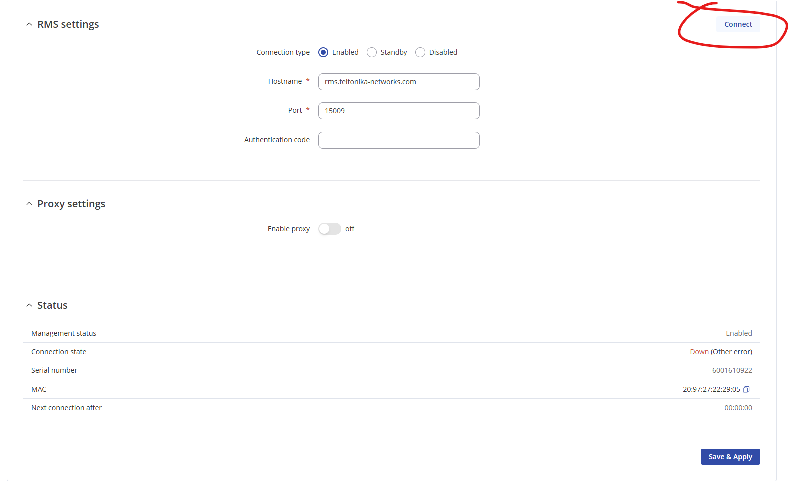 I’m using several TRB255/256 and TSW202/212 devices. I have a similar issue across all of them as well as across multiple firmware versions. During initial startup or after an internet outage the RMS service shows “failed to resolve HOSTNAME” or a similar error. It appears if RMS DNS lookup fails even once the service stops attempting to connect again? I have to manually remote into the devices and hit the connect button to initiate the connection again. @Marija This is an older firmware but the device that is currently in error.