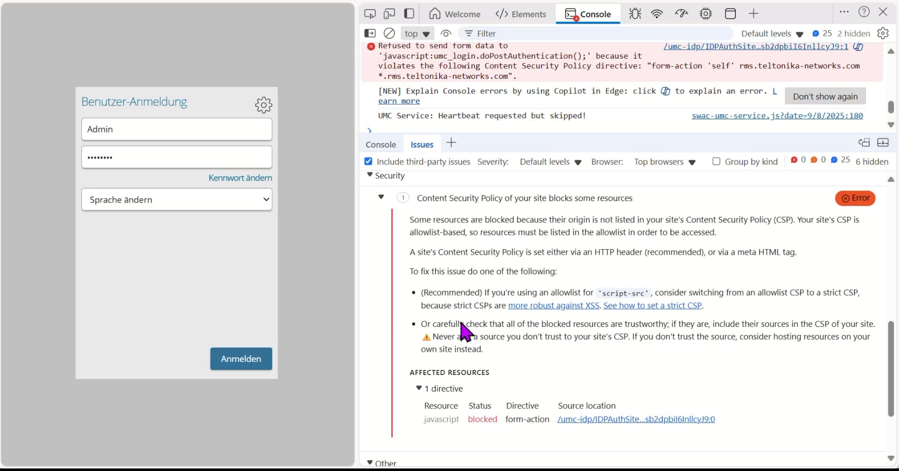 Hi, I am trying remote access on a SIMATIC Unified Basic Panel. It connects, works until after authentification. After clicking “Anmelden/Login” nothing seems to happen. I start Browsers dev console: Theres an stopping further progress.