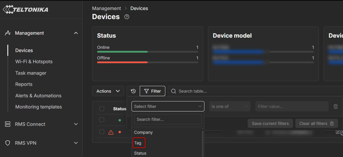 Press Management → Devices then press Filter and click on select Filter, you will see Tag there