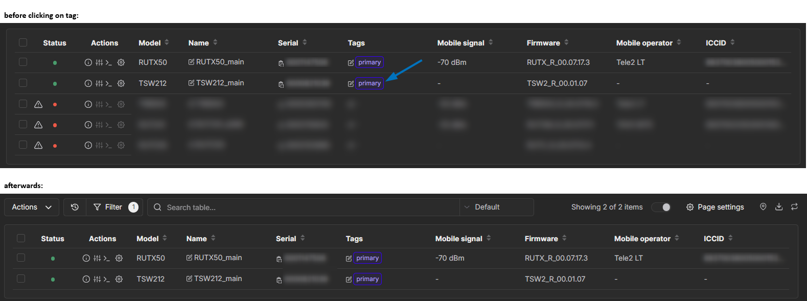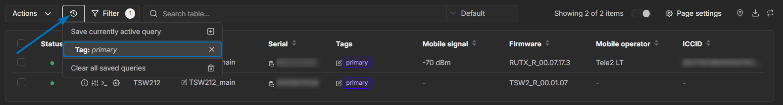 Alternatively, a simpler method, consisting of a single click and not requiring to write the tag index in search bar, would be to add a “Tags” parameter to the current table preset. Once clicked on, the table would automatically refresh to filter devices by the selected tag:
