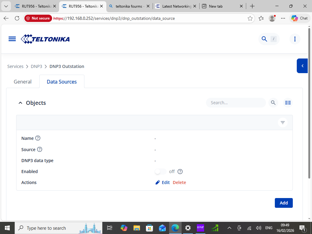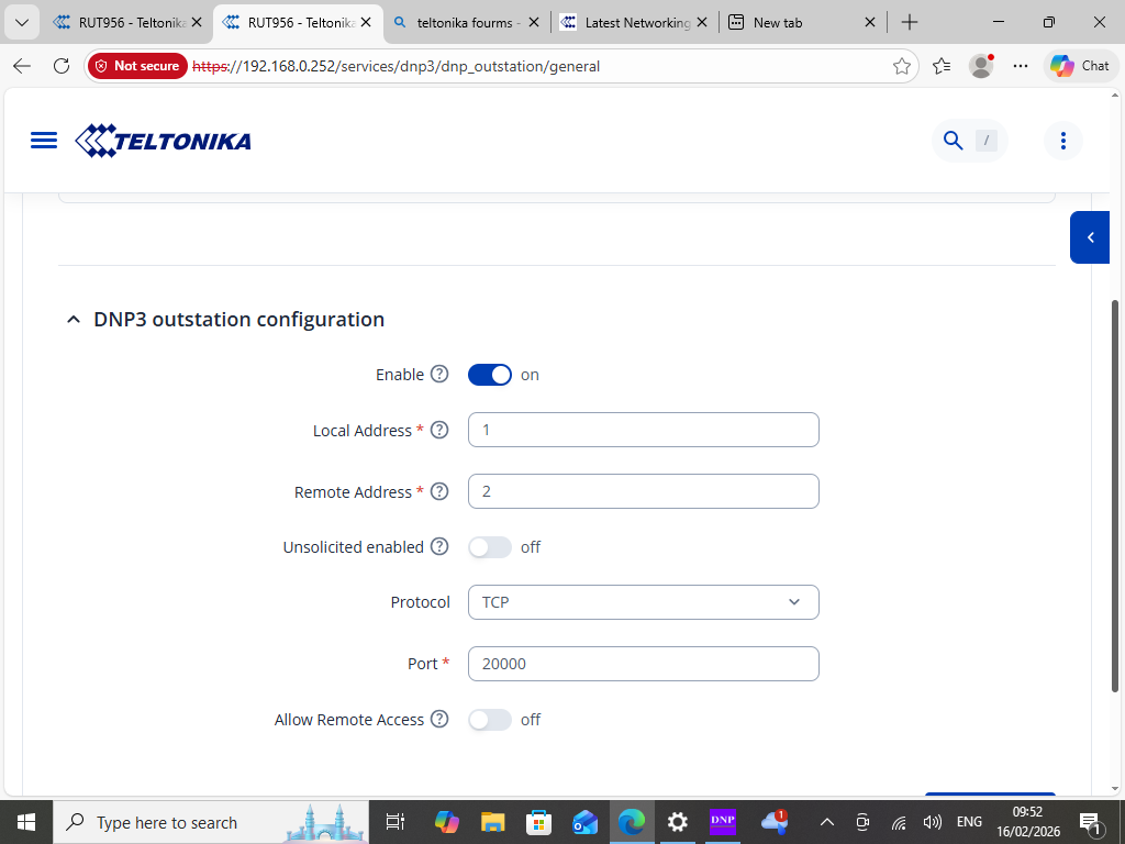 This is also expected behaviour. The moment the RUT956 DNP3 Outstation is enabled, the firmware automatically publishes its full set of internal system parameters - regardless of whether you have manually added any data objects. Your master software is performing an integrity poll (a standard DNP3 startup behaviour) and receiving all of these auto-published objects in response.
