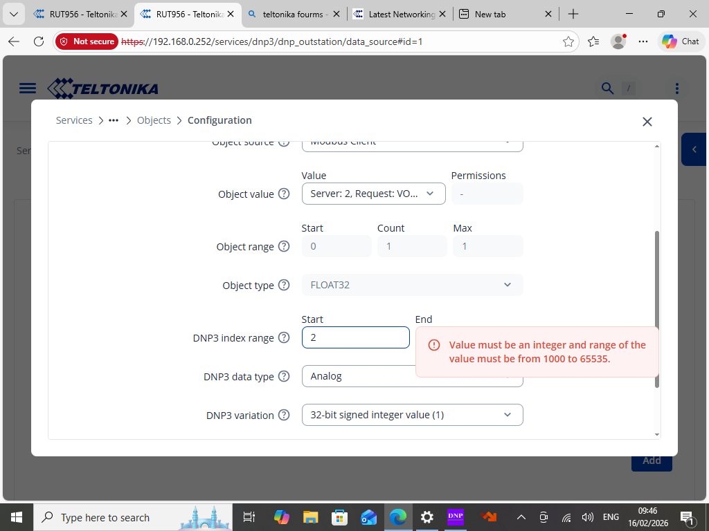 When you map a value into the RUT956 DNP3 Outstation via the Data Sources configuration, the index range is intentionally restricted to 1000–65535. This is by design. The RUT956 firmware permanently reserves indexes 0–999 for the router’s own built-in system telemetry (Uptime, Signal Strength, Hostname, Connection State, etc.), and those cannot be overwritten by user-defined mappings.