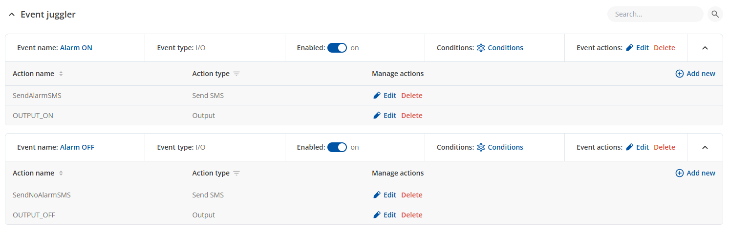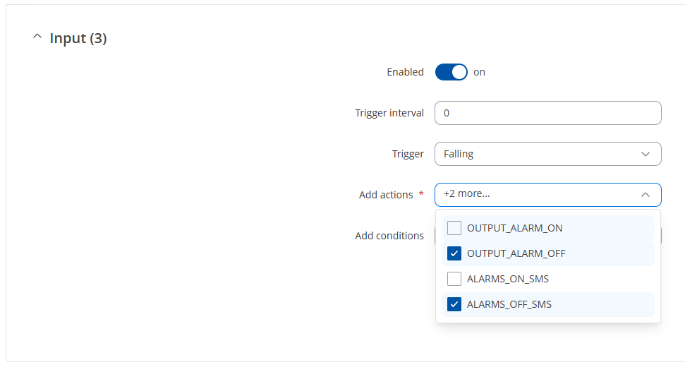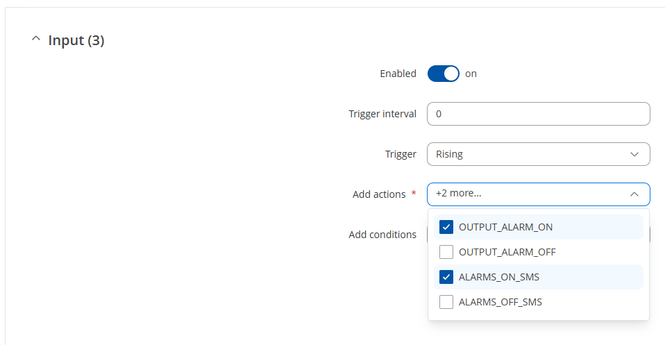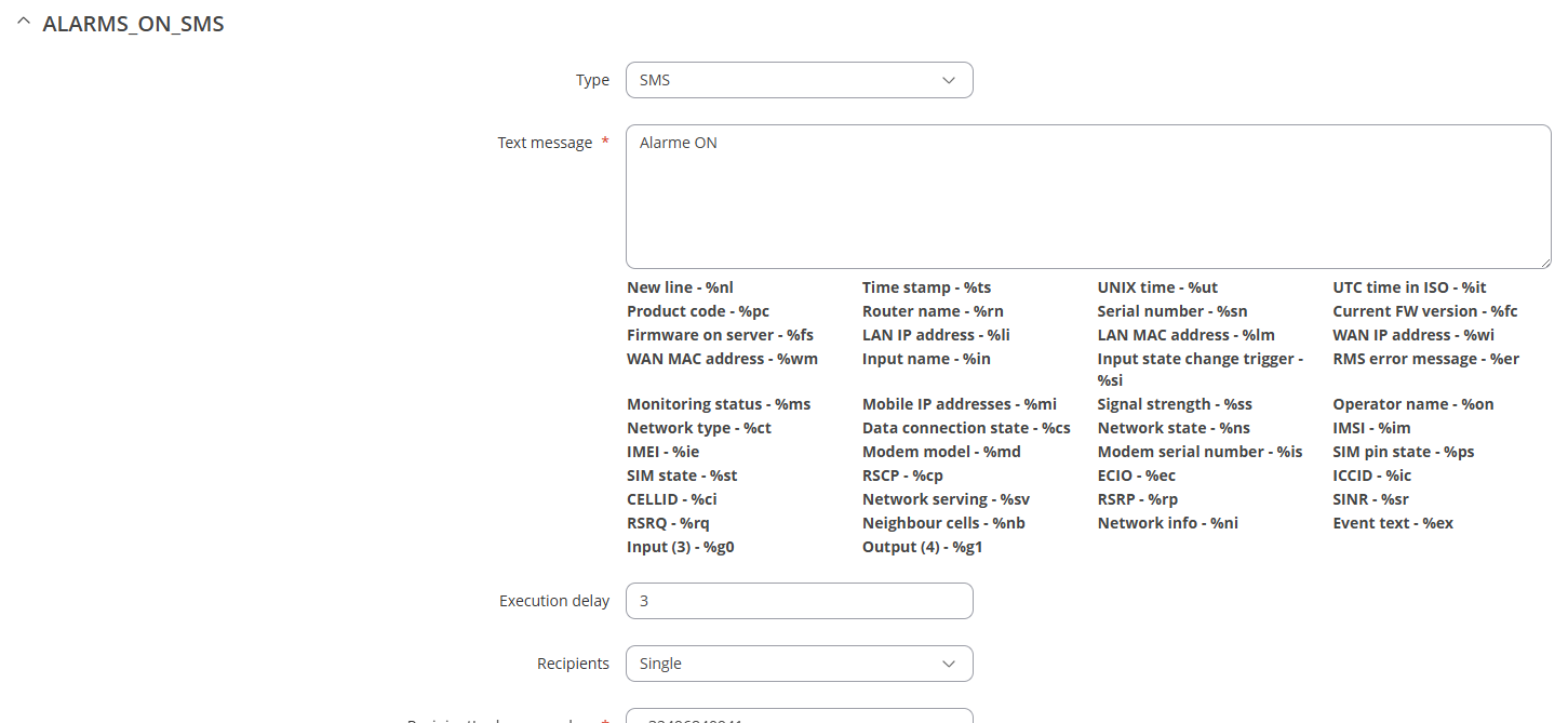 I’m currently trying to achieve something that seems easy : send an SMS when the input is rising to 1. I configured everything properly, as per the printscreens below. When the input rises to 1, I also setup the rule to set the output to 1. This last one works, but no sms is sent. When the input fall to 0, I setup the rule to set the output to 0. Once again, this last works, but still no sms sent. I tested the sms function in the Service>Mobile Utilities>Messages>Send Messages, and it works (sim card and network is ok).