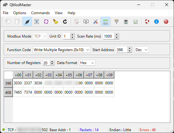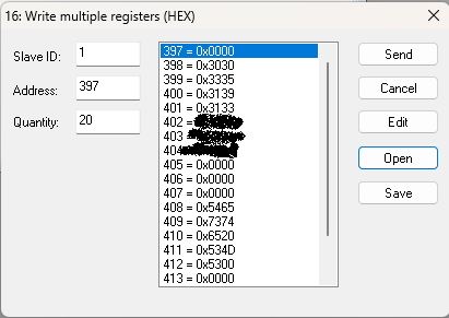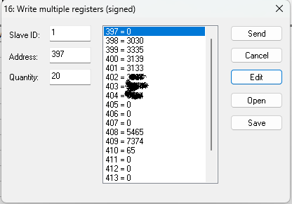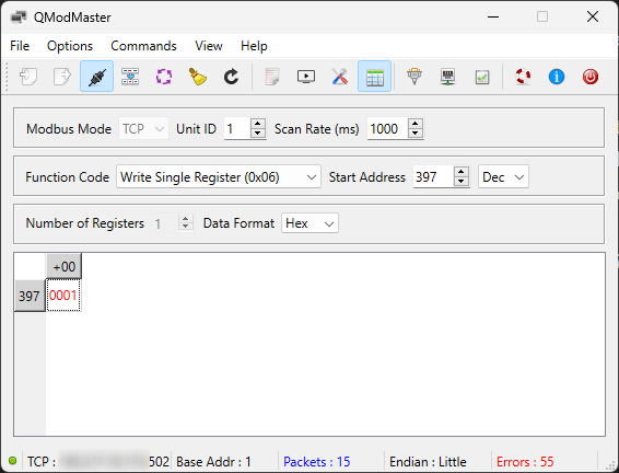 In the meantime, could you please confirm what data type you are selecting when writing the value 1 to register 397? If it’s in HEX, then 0001 should be used instead of 0/1.