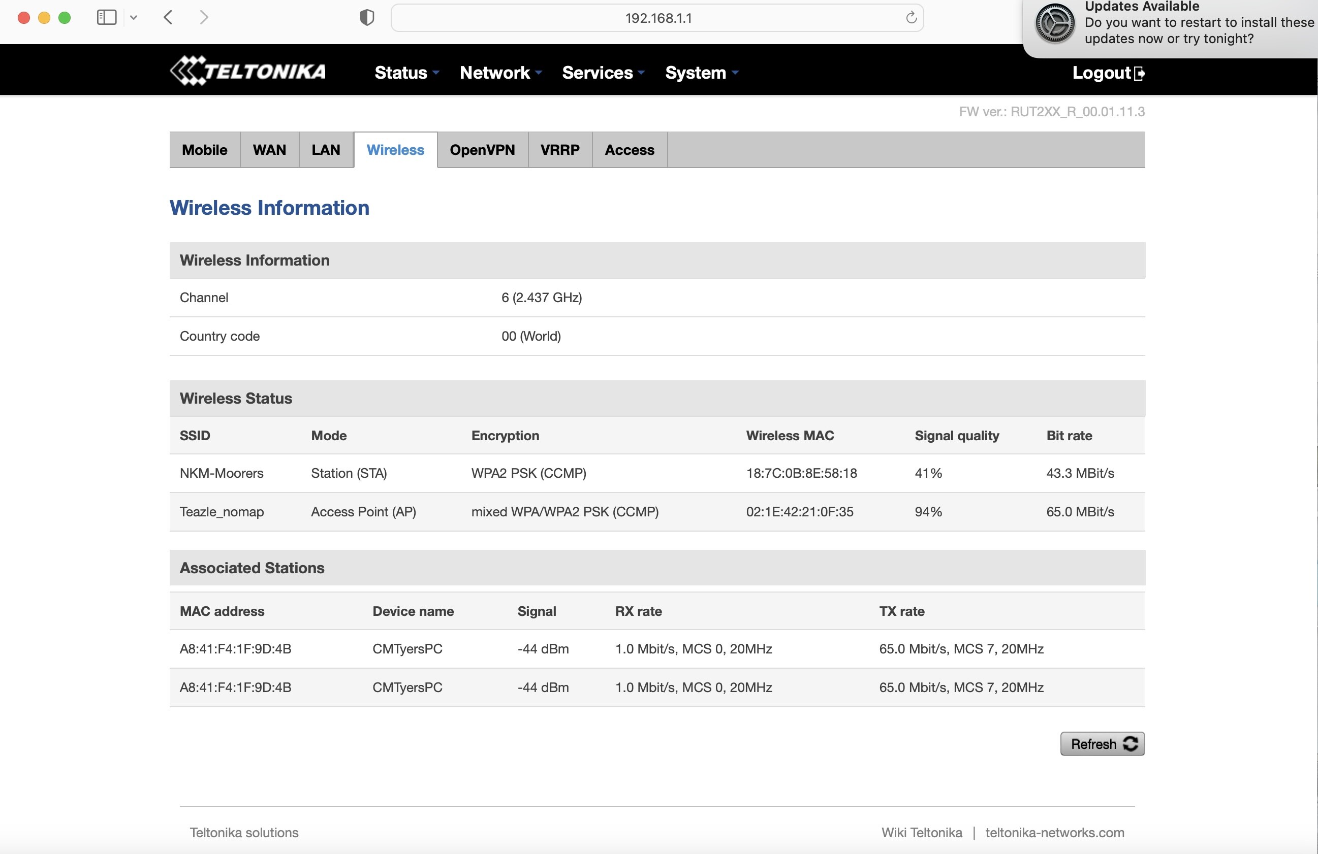I can connect to the router. As far as the wireless interface status (I will try and attach screenshots) and firmware (RUT2XX_R_00.01.11.3) - the firmware will be pretty old, as it was originally set up about 5 years ago.