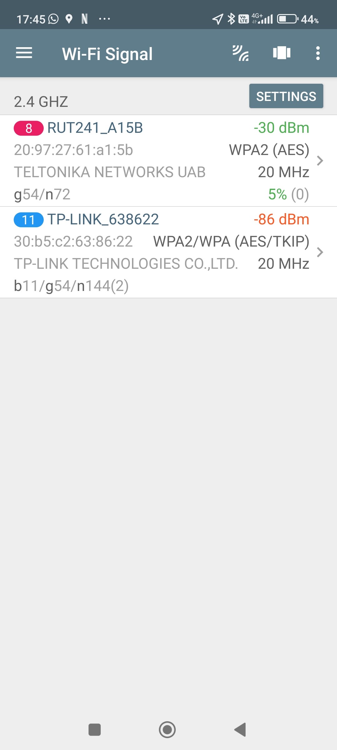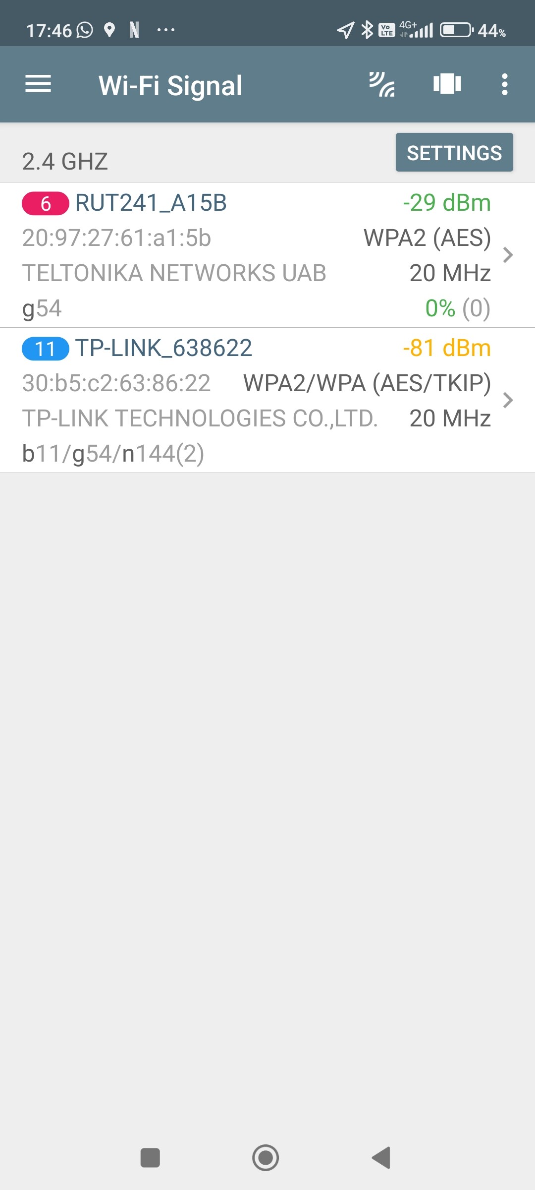 I also have a dog with a mobile tracker attached to her collar (https://tractive.com/) This device allows me to find my dog if it ever runs off. The tracker has a power saving mode which switches the tracker GPS off when within range of user specified WiFI signals. This works fine with my home wifi but I’m unable to get it to detect the WiFi being provided by the RUT241.