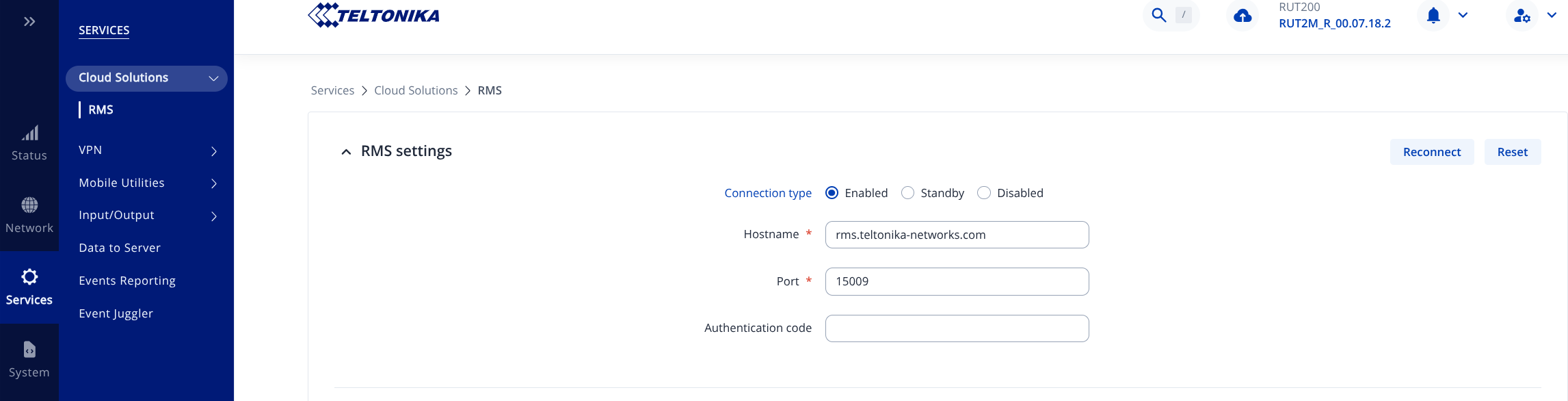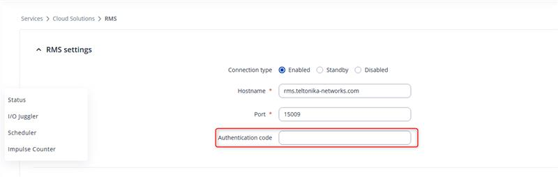 If the code was presented, it should be entered in the router’s RMS settings: Services → Cloud Solutions → RMS. Enter the code in the field highlighted in red in the screenshot below: