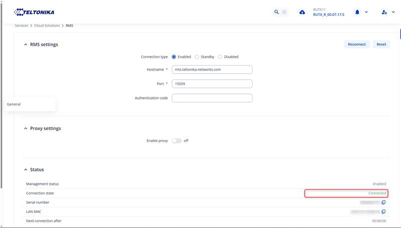 - Additionally, if you have access to the device’s WebUI, could you please clarify the RMS status? You can find it in Services → Cloud Solutions → RMS. It should look similar to this screenshot: