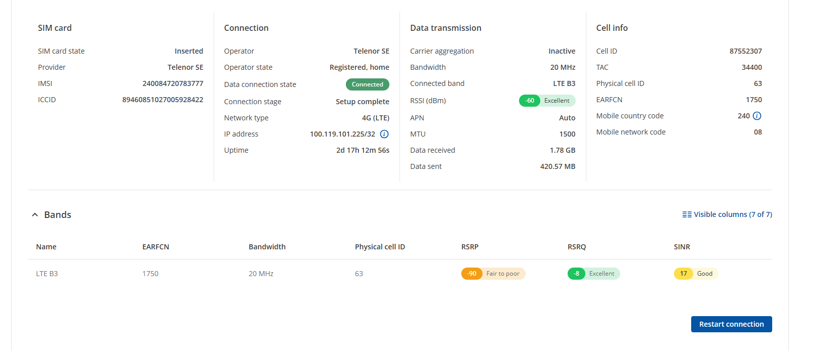It would also be helpful if you could provide a screenshot from Network → Status → Mobile with any sensitive details hidden (such as public IPs, IMEI, ICCID, cell ID, etc.).