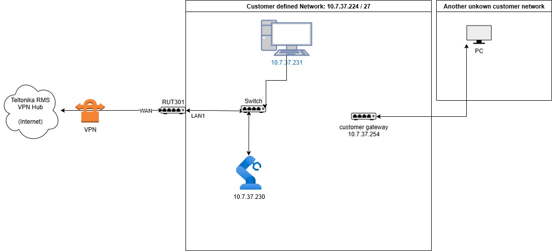 We have a customer that wants our robot to be part of his exsiting machine-LAN. We shall also provide remote support. In terms of my networking knowledge, I told him that he needs to set up a static route on his gateway for our VPN traffic. However, he seems reluctant to do so. VPN traffic breaks as soon as we set the gateway to 10.7.37.254.