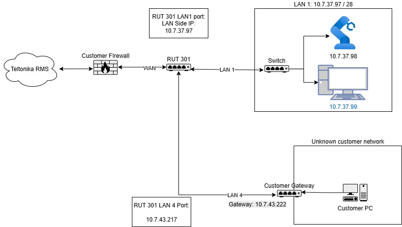 The customer has provided connection to the Teltonika RMS on WAN side port of the RUT301. We want to use the RUT301 and Teltonika Cloud (VPN Hubs) for remote access.