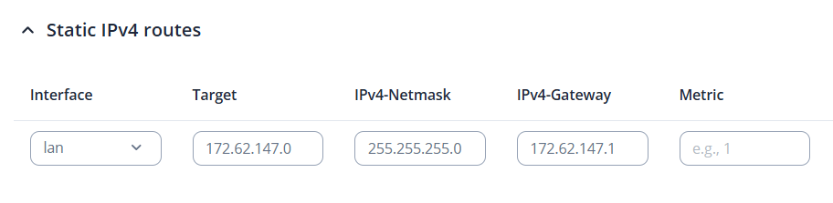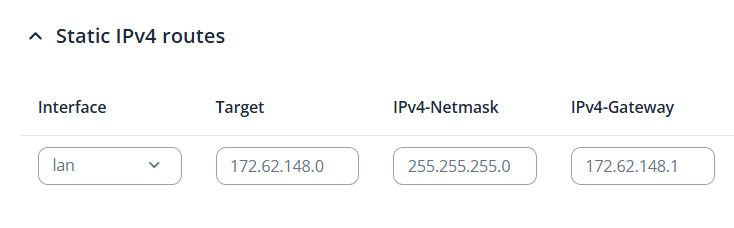 2.Add a Static route under Network → Routing → Static Routes on the RUT906 Device 1: