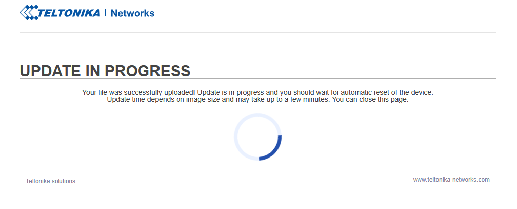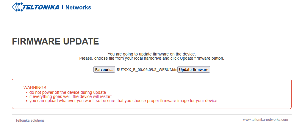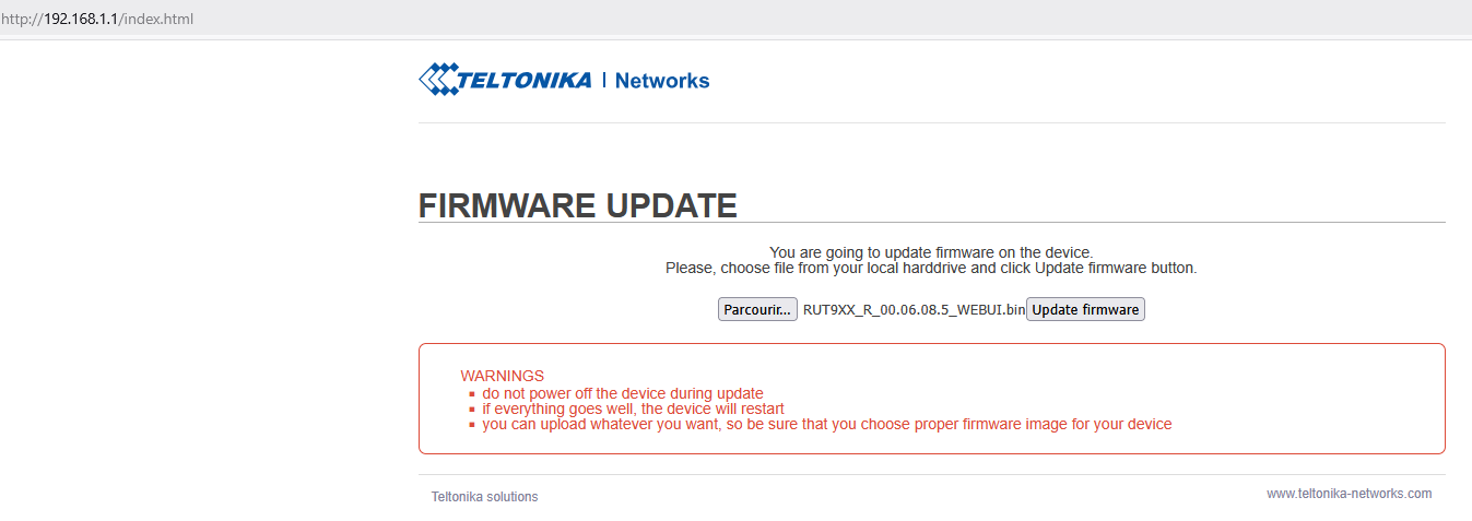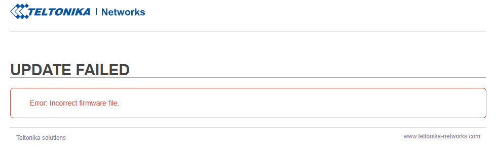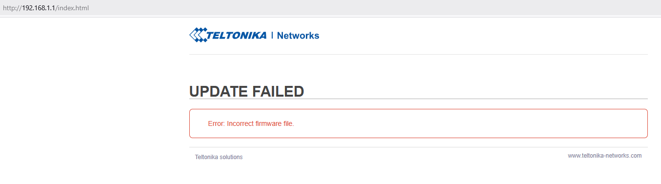 If I try to update with a newer firmware (RUT9_R_00.07.06.19_WEBUI.bin), I get "Update in progress, the signal LEDs flash one to one then all the LEDs flash simultaneously annd never stop.