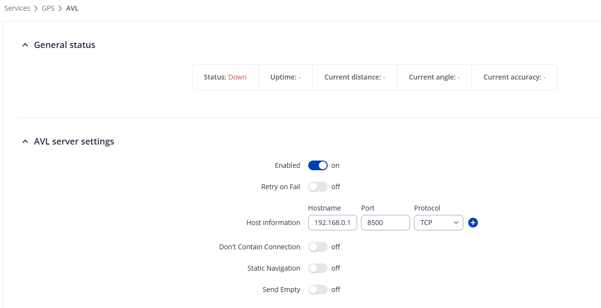 Does anyone have any information on the settings for a rut955 to interface with the web server service GPS-Server. I have the url and port settings from them. Uploaded the imei number of the device to their website.. turned on gps and enables all 3 services.. does the ip address and port go in the AVL menue or somewhere else?