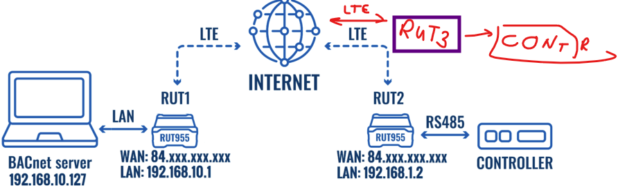 Yes, this will work, as long as the RUT3 also has a RS485 → Controller connection.