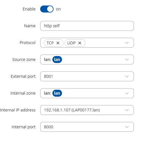 In that case, the port forwarding rule should point to the source zone “WAN” rather than “LAN”.