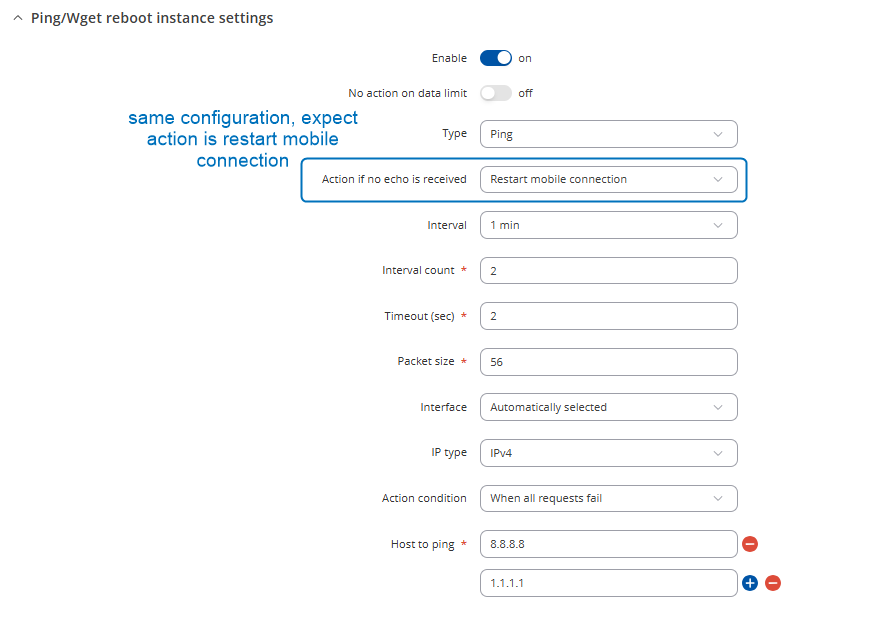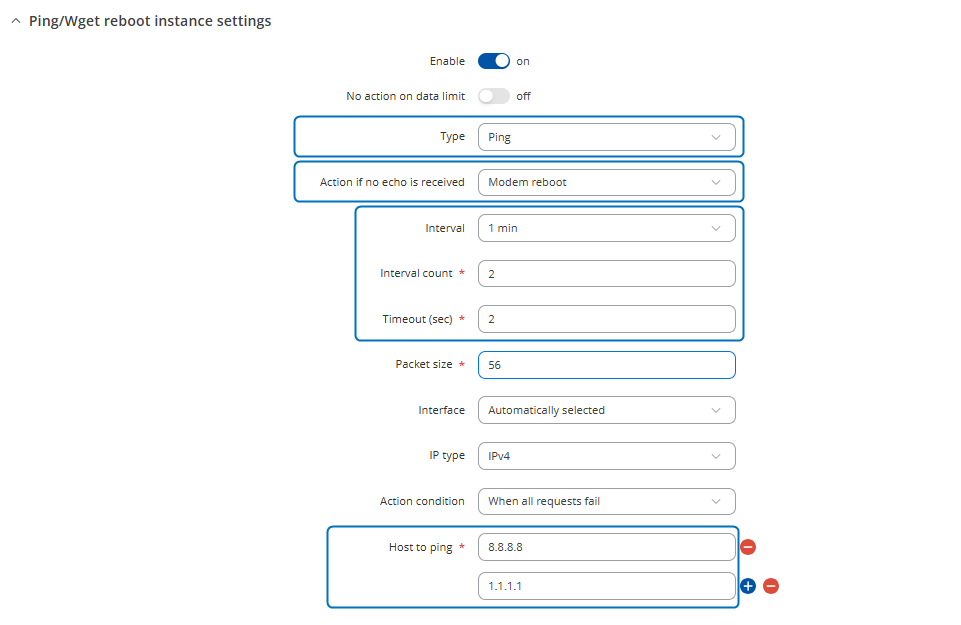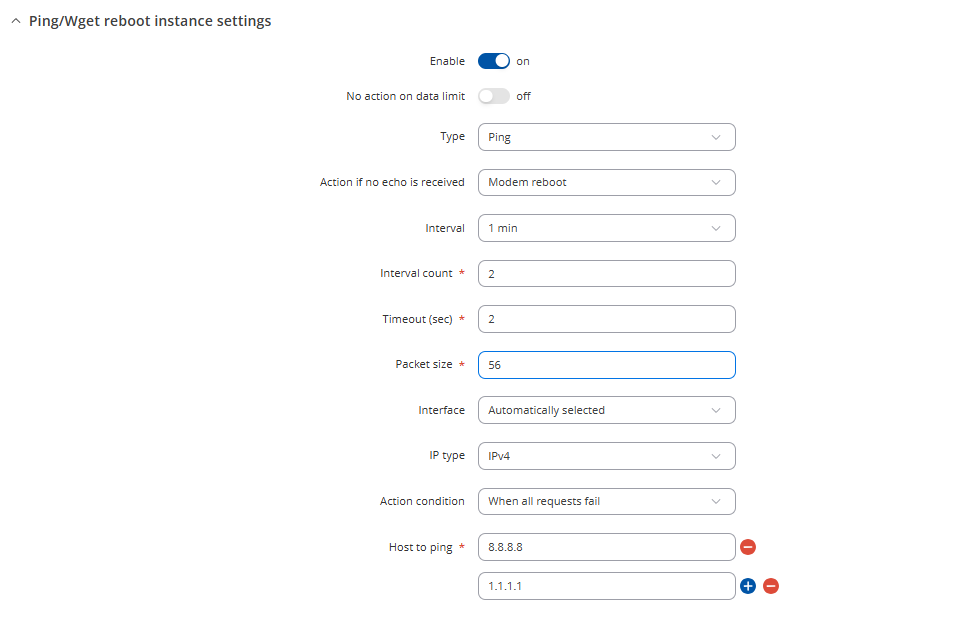 Ping/Wget Reboot functions periodically send ICMP ping requests or HTTP/HTTPS (Wget) requests to a specified IP address or domain and wait for a response. If no response is received, the device will retry a defined number of times at a set interval. If there’s still no response after those retries, the router will automatically execute the selected action. This is typically used to detect a loss of internet connectivity or an unreachable remote host and react accordingly.