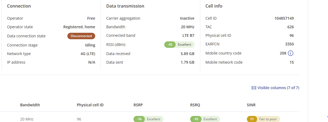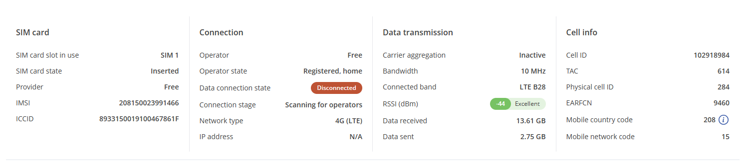 Sometimes I have a very weak connection, despite strong signal and SNR-data, but when I try to reconnect I get silly messages of the modem, like showing registered and name the operator, but at the same time scanning for operators and no connection (see screenshot)