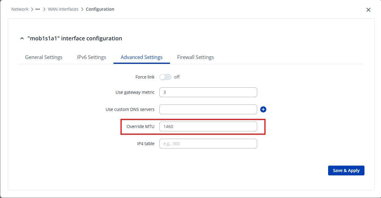 MTU controls packet size and is typically set to 1500 by default. For testing purposes, you can try lowering it to values such as 1460, 1420, or 1380 and observe whether this has any impact on performance. To modify this setting, navigate to Network → WAN, edit the mob1s1a1 interface, open Advanced settings, and adjust the Override MTU value as shown in the screenshot.