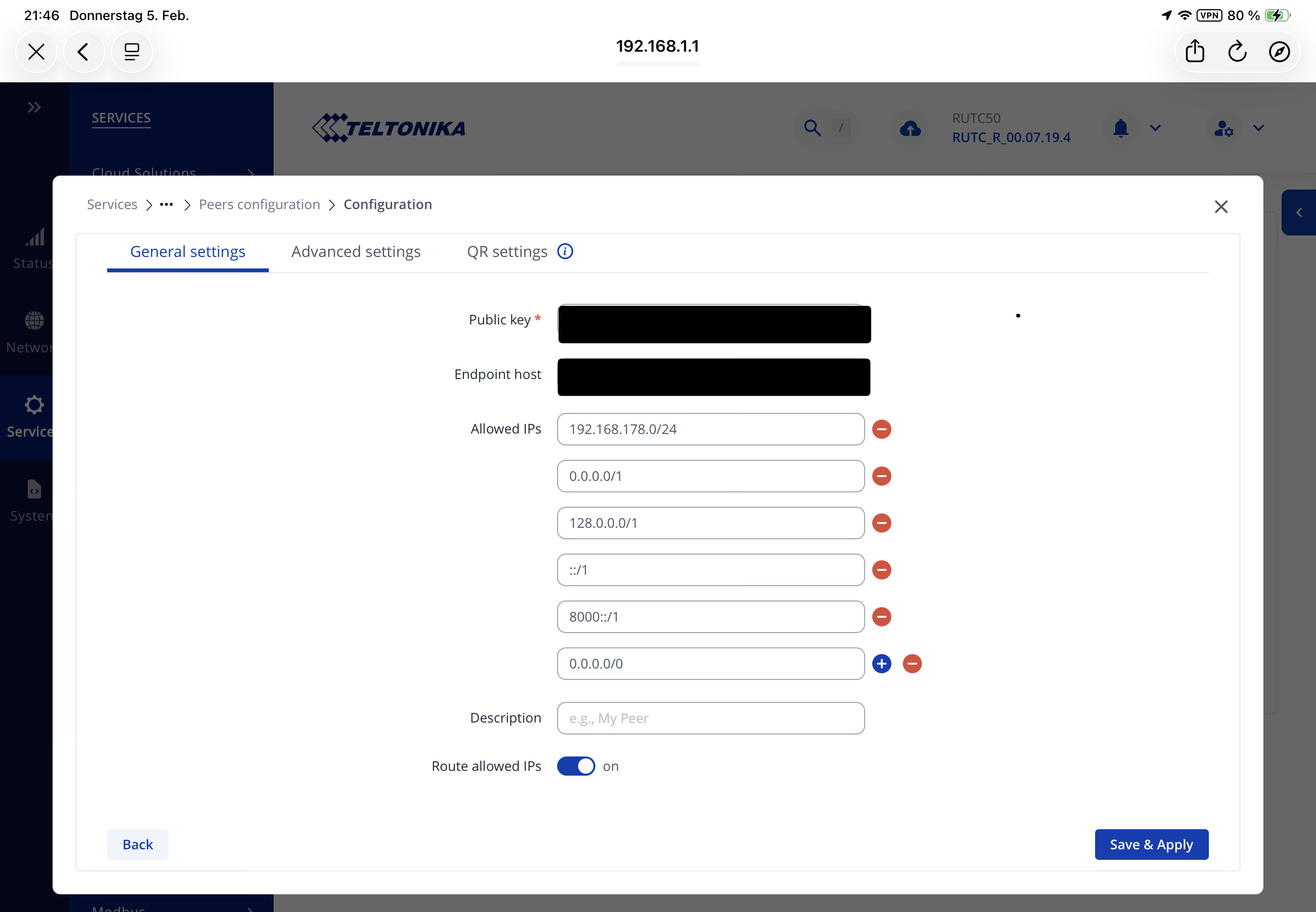 Hi all, I bought the RUTC50 for my Camper to be able to connect from anywhere via VPN to my FRITZ!Box at home to stream German TV when I don’t have Satellite connection. My old FRITZ!Box could only handle IPsec VPN, which I could not get it running with RUTC50, even in the community no solution. So I bought a newer FRITZ!Box with WireGuard available : easy stuff I was told.