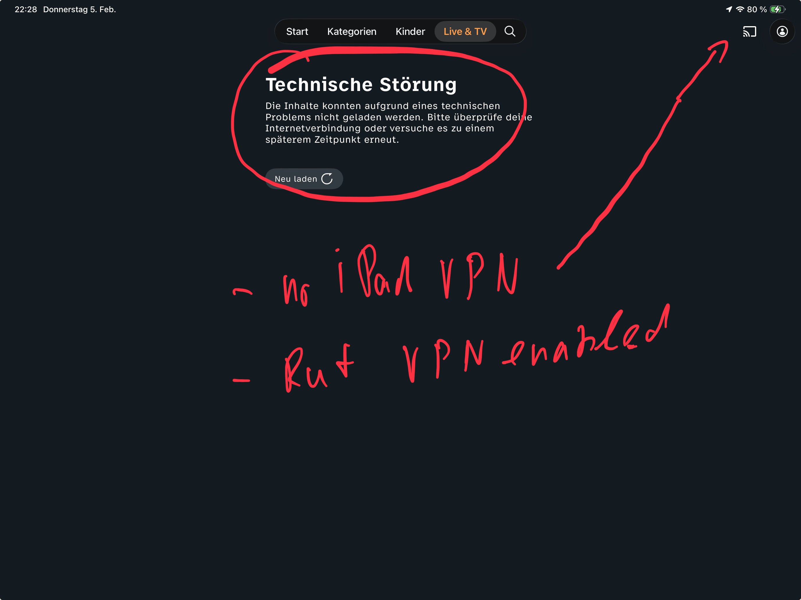 When I turn on VPN on my iPad, streaming German TV works perfect !! and I can watch everything on my iPad.