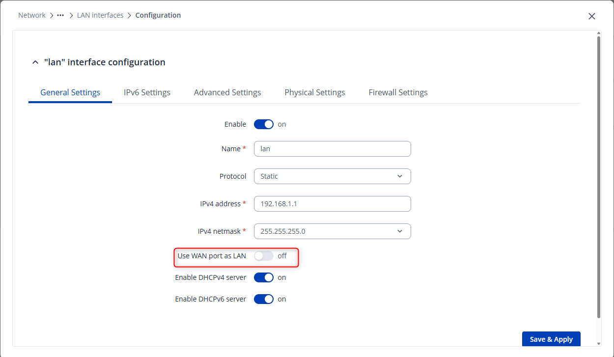 To make the WAN port visible, you need to edit your LAN interface and enable the Use WAN port as LAN option. To do this, navigate to Network → LAN , edit the interface, and enable the toggle that allows the WAN port to be used as LAN, as shown in the screenshot.