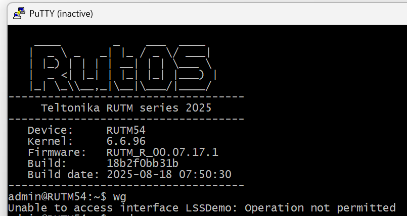 I am trying to get my RUTM54 to connect to a PfSense firewall with Wireguard. When I follow the guide at Wireguard Peer To Peer Configuration example - Teltonika Networks Wiki it says at the end I should check the config in the CLI with the wg command. When I do that I get an error: