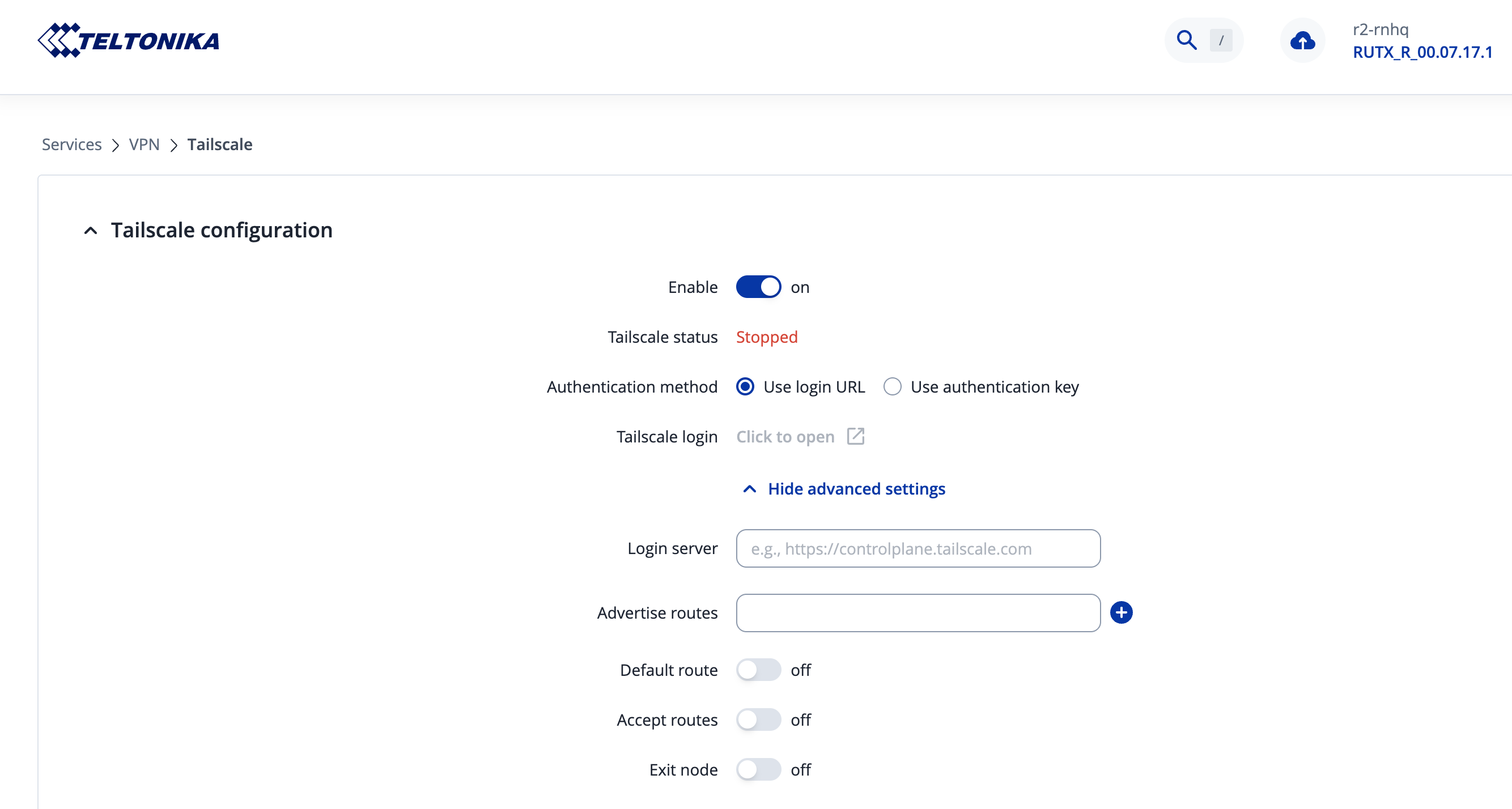 We officially declare which Tailscale version is supported by RutOS and ensure that it is fully integrated into the RutOS ecosystem. Manual updates break this integration and may cause the service to stop working.