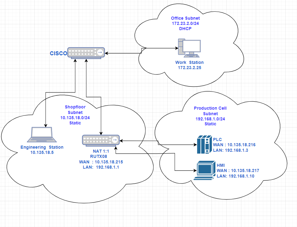 We have the configured CISCO router to which i don’t have the access. On this router we have two subnets Office (DHCP) and Shop Floor (static). We didn’t have any issues with connections between them later. For connecting production cell to shop floor network we install RUTX08 router and configure it as NAT 1:1 (all IPs are on picture).