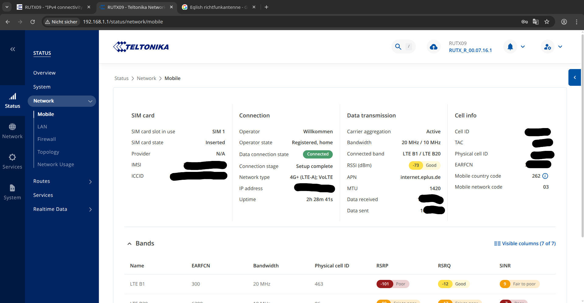 Attached I put 2 screenshots of the “Status → Network → Mobile page” showing the “instable behavior”.