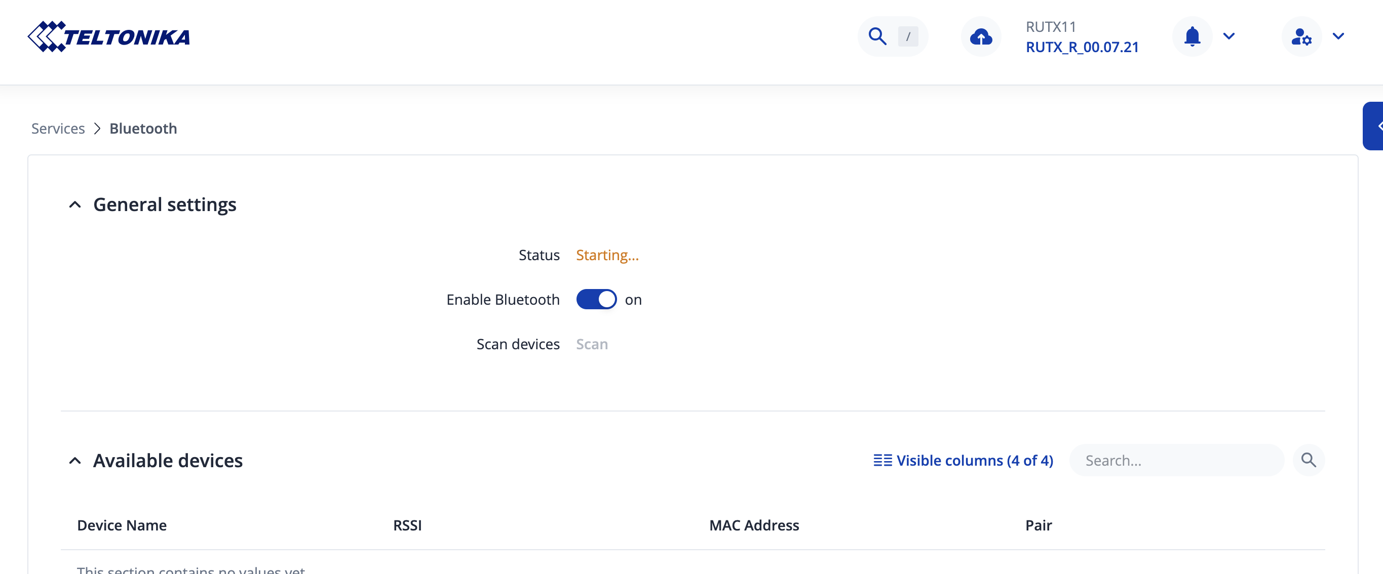 Hi, I’ve just purchased a RUTx11 and I’m trying to start Bluetooth, but it keeps cycling between Status: Starting and Status: Down.