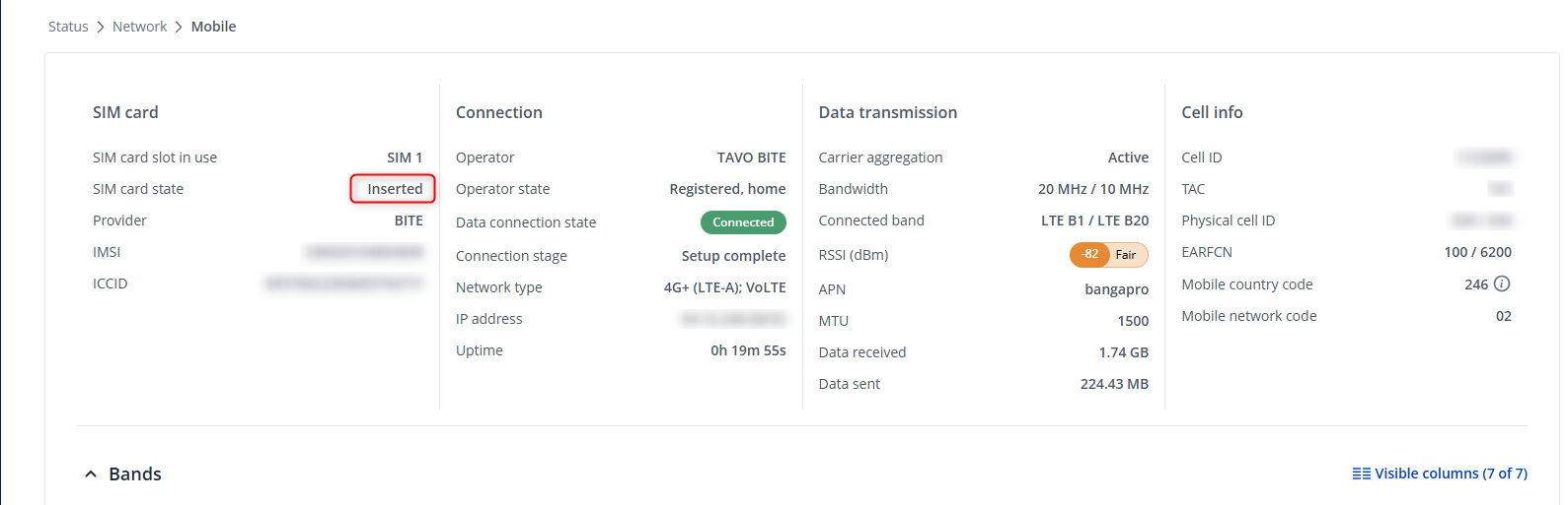 If the SIM card is inserted, but you’re unable to connect to the internet, check the APN settings in Network → Mobile → General.