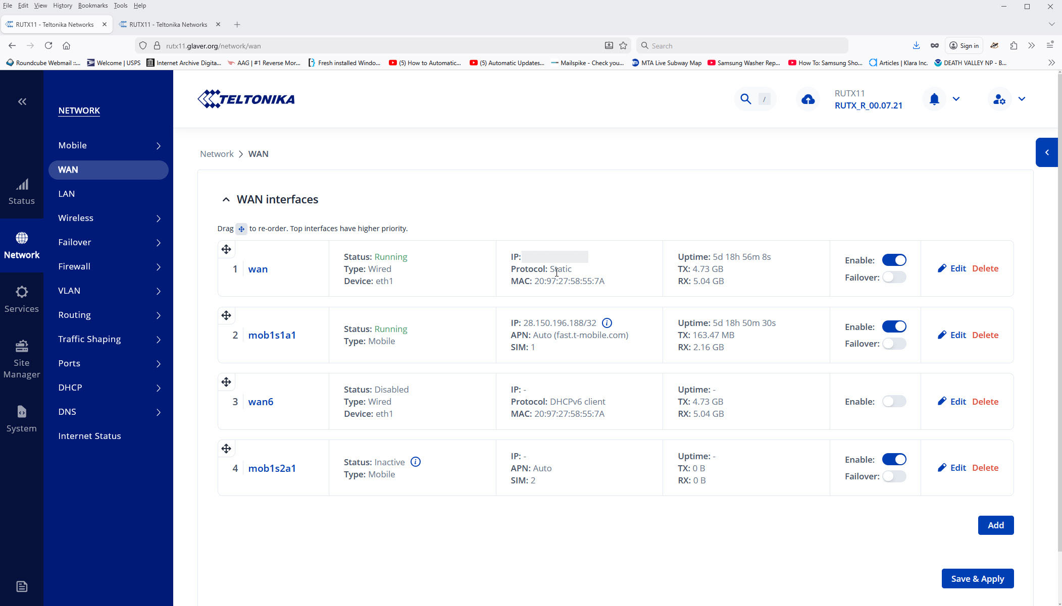 Just chiming in - I see you have IPv6 address assigned to your mobile interface as well, and most applications prefer IPv6 over IPv4. If you don’t have IPv6 on wired wan, I’d suggest changing your PDP type on mobile to IPv4 only to avoid confusion, as even if mobile interface has a higher metric (lower priority), it’s IPv6 prefix will still be preferred over wired wan IPv4