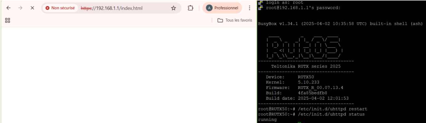 The issue has been partially resolved by accessing the device via Phone & RMS. There seems to be a problem from the PC/Windows end. Adding the uhttpd-ca.crt file to the trusted certificates list did not help, nor did the bootloader reset. In case the user finds what the cause is, they can share their solution here.
