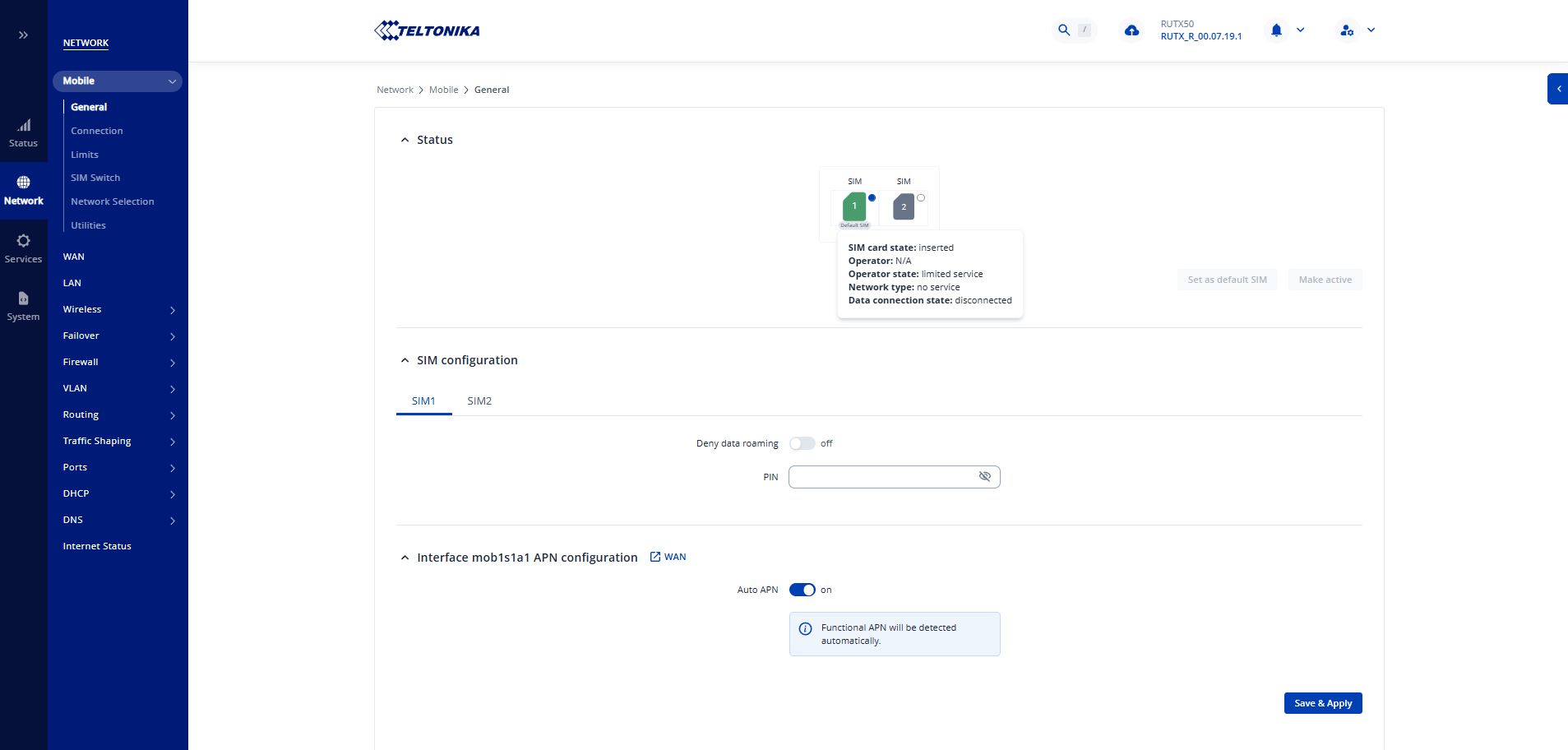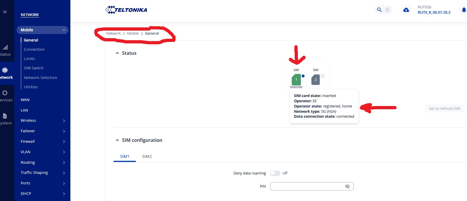If a PIN code is required, you can enter it by navigating to Network → Mobile → General . In the SIM configuration section, you should find a field where the PIN code can be entered. After entering the PIN, click Save & Apply and allow the device a moment to reconnect to the network.