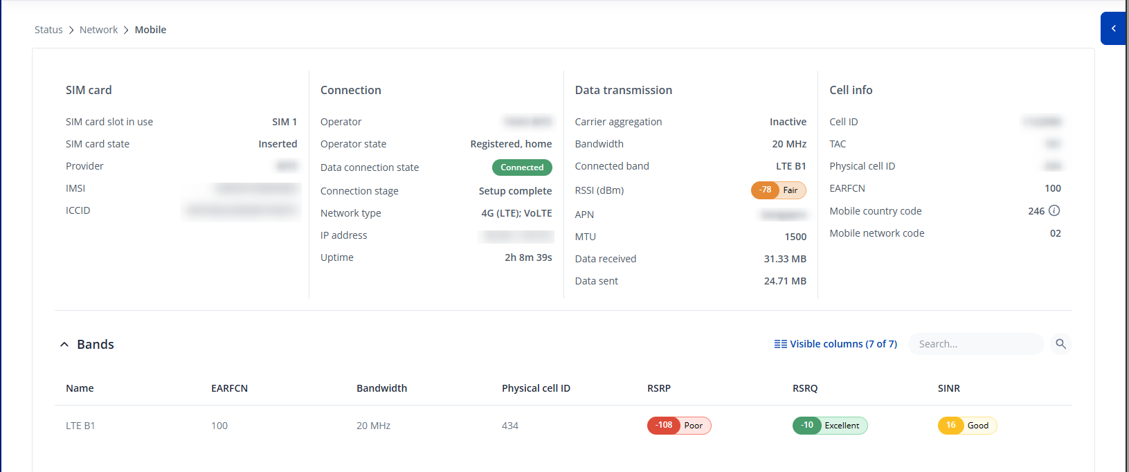 A screenshot of the Status → Network → Mobile page.