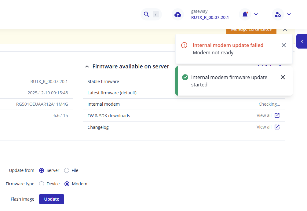 Then as soon as I logged back in my RUTX50 I got (again) the message to update the MODEM. And it FAILS!
