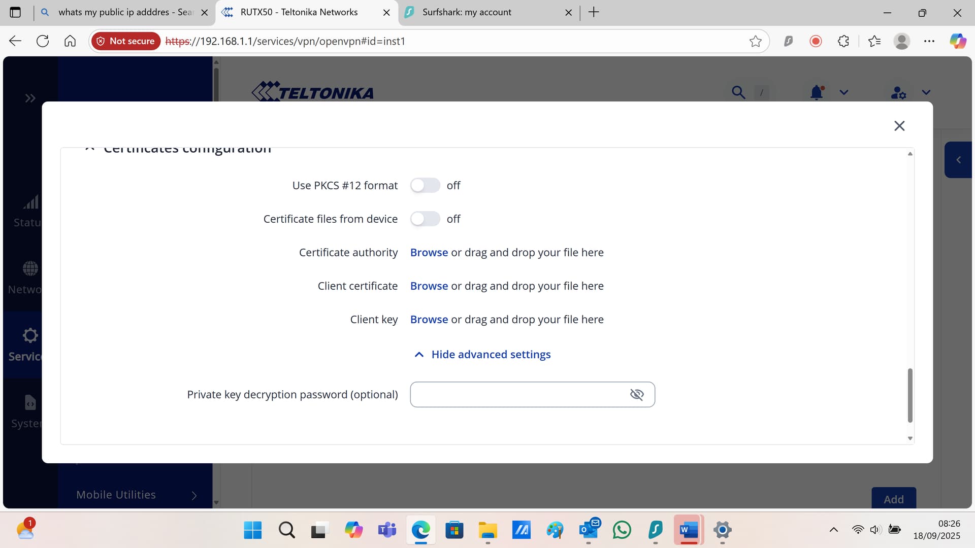 Good afternoon, is there any available up to date instructions fo how to populate the RUTX50 with either wiregaurd or open VPN. I need to set up a dedicated IP address… im currently using a surfshark vpn account.