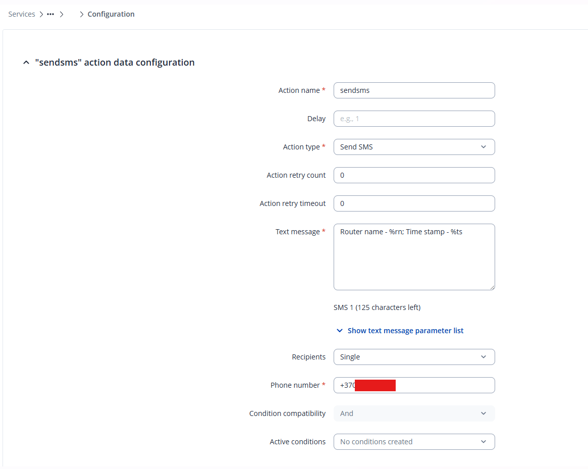 Click Next, then choose Send SMS as the Action Type. Enter the message text you want to send. You can also adjust additional settings such as retry count, retry timeout, and delay, if needed.