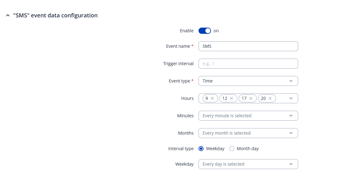 Enter an event name and set the Event Type to Time. Then select the hours when you want the SMS message to be sent.