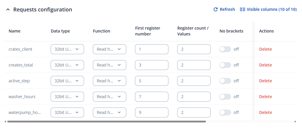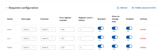 I’m able to configure the Modbus TCP Client to request data from my modbus device. I have configured 5 request configurations and I’m able to receive the data from the register.