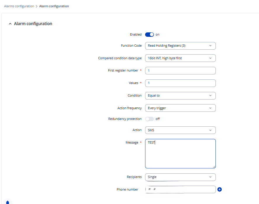 I am having a RUT 200 and Modbus slave device which is connected as Modbus TCP/IP slave.I need to send an SMS along with Modbus register value whenever the register value changes.I am able to communicate with Modbus device and tried to send a SMS by using Alarm configuration but it allows only Text no provision to add register value.