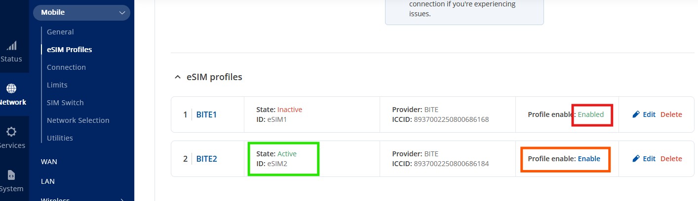 Image: Screenshot showing Web GUI after “SIM switch” (to eSIM profile 2) has happened; eSIM profile 2 showing “Active” but not “Enabled”.