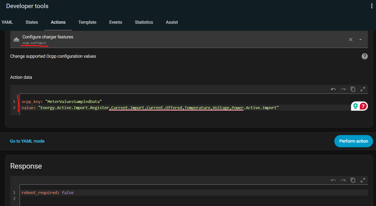 Below is the screenshot from Home Assistant showing the OCPP command to be sent to the charger to configure the measurands availability. Please note that Advanced Mode under your profile needs to be enabled for the Action item to become available.